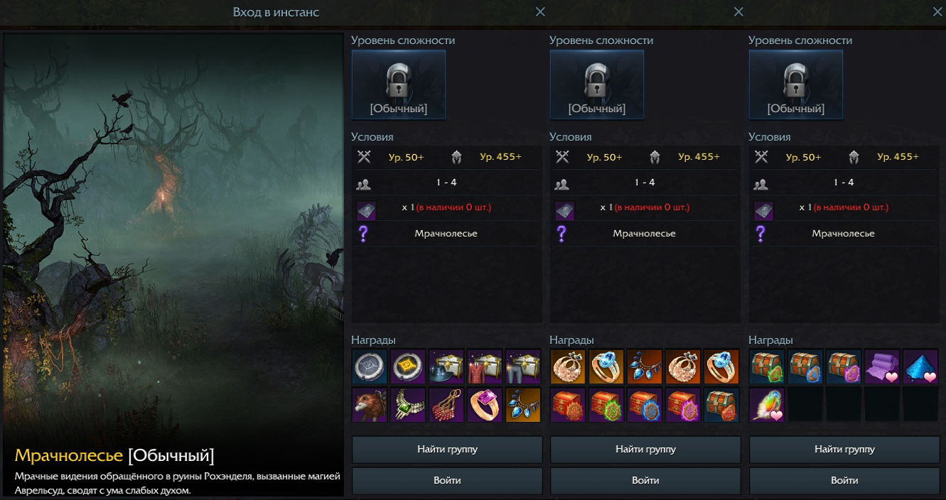 Войти в следующий лабиринт — Мрачнолесье, смогут самые сильные герои! Если ваш рейтинг снаряжения 455-го уровня и выше — портал откроется. Подобно Роще Иллюзий, Мрачнолесье — также морок. Это образ иного Рохэнделя, проигравшего войну с Термером третьим. Высокие башни обратились в прах, вся магия ушла, а леса стали мрачными и неприветливыми. Чудовищные иллюзии этой магической аномалии часто губят случайных путников.
