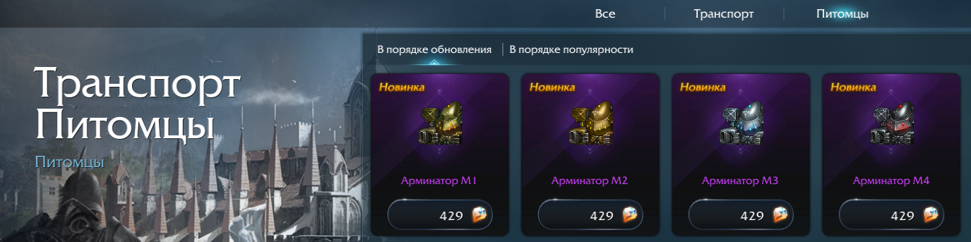 Вкладка «Транспорт» переименована в «Транспорт Питомцы» (правда, не вся — изменение в горизонтальном меню выбора вкладок будет добавлено позже). В ней появились 4 питомца эпического качества — это Арминаторы в разных расцветках.