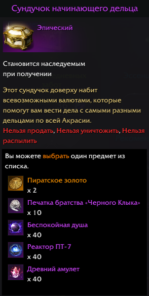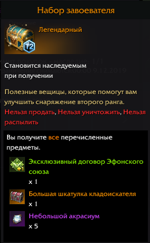 . В его состав входят: Походный ларчик, Сундук со случайным эпическим подарком и сертификат Эфонского союза — все по 1 штуке, покупка возможна 1 раз в день.