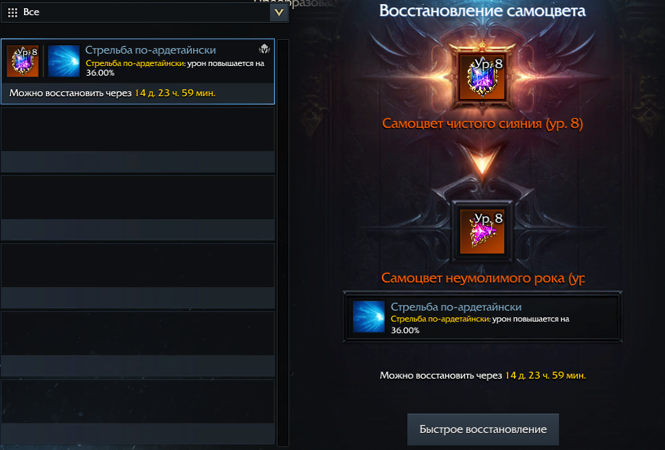 Система предусматривает возможность восстановления преобразованного самоцвета до исходного состояния. Стандартный срок восстановления составит 15 дней, однако появится альтернатива — мгновенное восстановление за счет расходования определенного количества синих кристаллов.