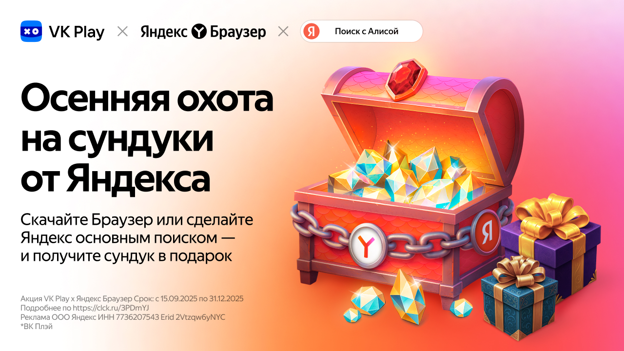 О: После выполнения всех условий акции ожидайте СМС с промокодом на номер телефона, привязанный к Яндекс ID. Получение сообщения может занять от 14 до 21 дня. В СМС вас будет ждать информация по дальнейшей активации в виде ссылки на Маркет VK Play. Использовав пришедший промокод при активации сундука в Маркете VK Play, вы получите новый промокод, который необходимо активировать на сайте игры. После этого награда появится в разделе «Мои предметы», а вы сможете перевести ее в игру.