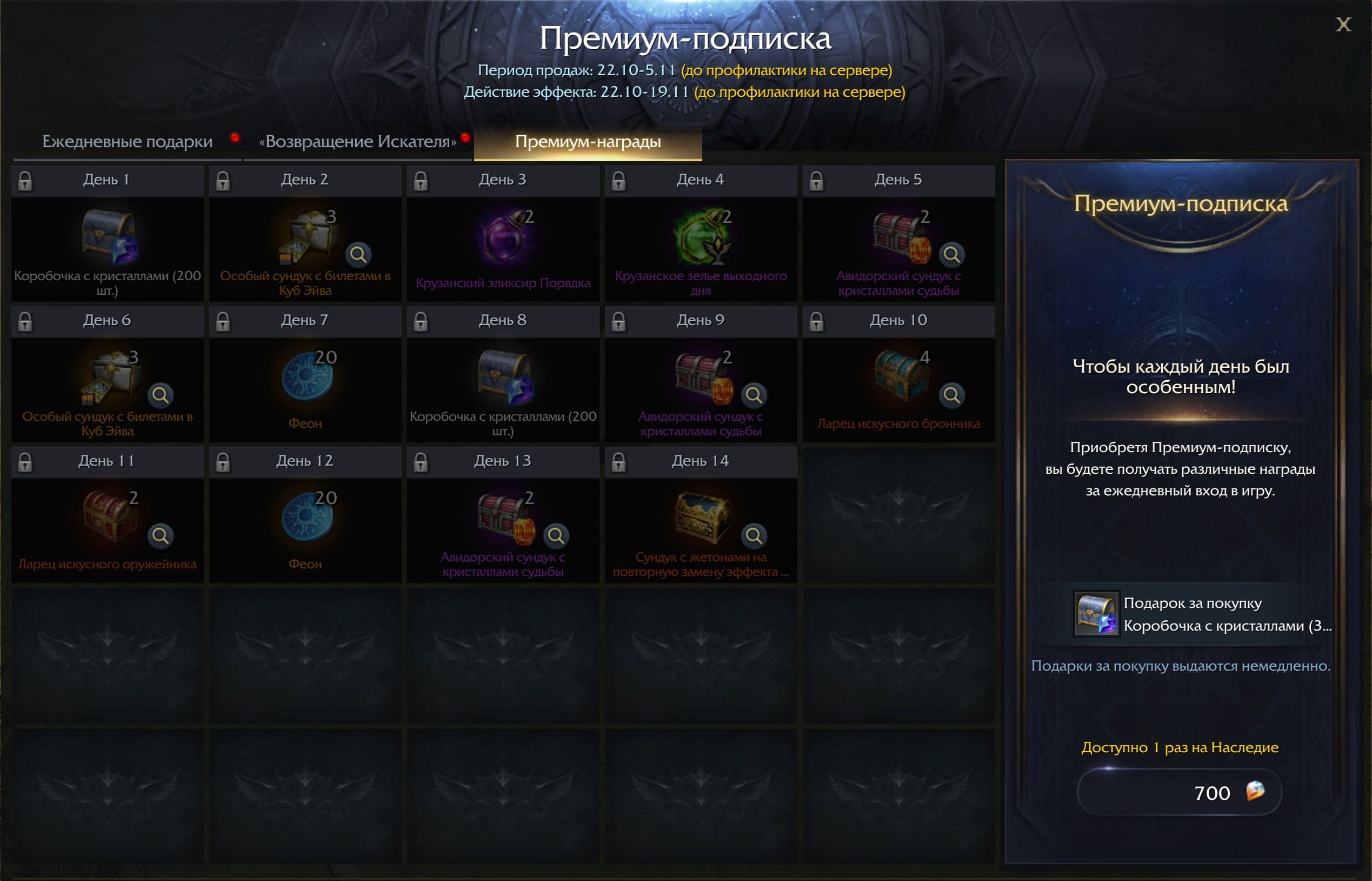 Возможность покупки и активации премиум-календаря доступна до 05:59 мск 5 ноября, а награды можно получить до 05:59 мск 19 ноября. Для получения всех наград требуется заходить в игру в течение 14 дней.