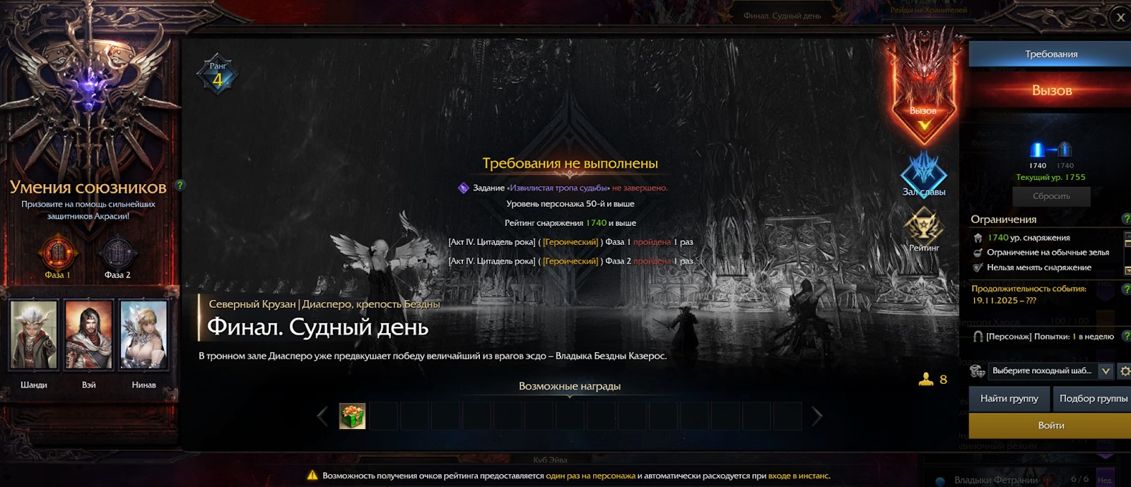 - иметь рейтинг снаряжения 1740 и выше;