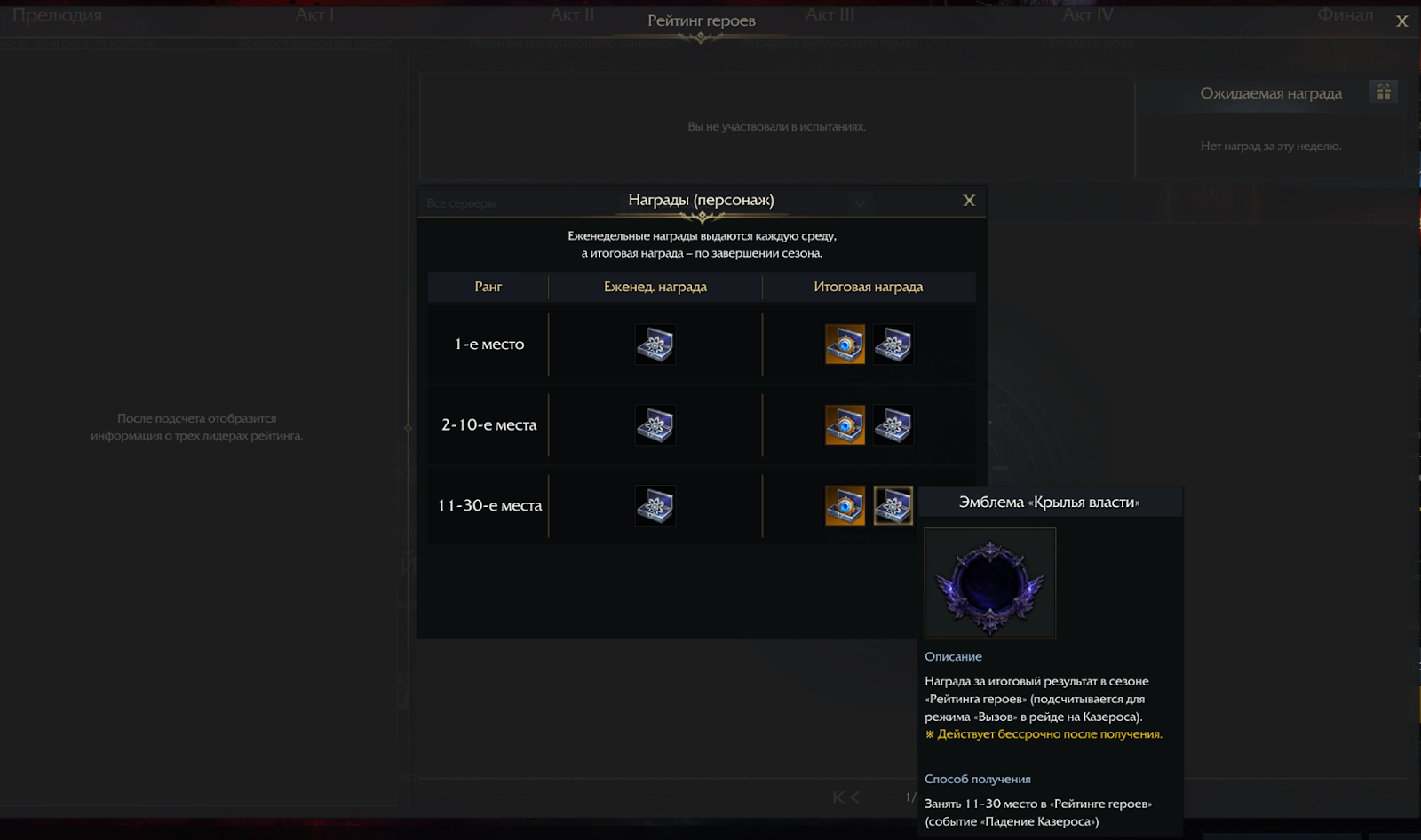 - пройти обе фазы «Акта IV» на героической сложности;