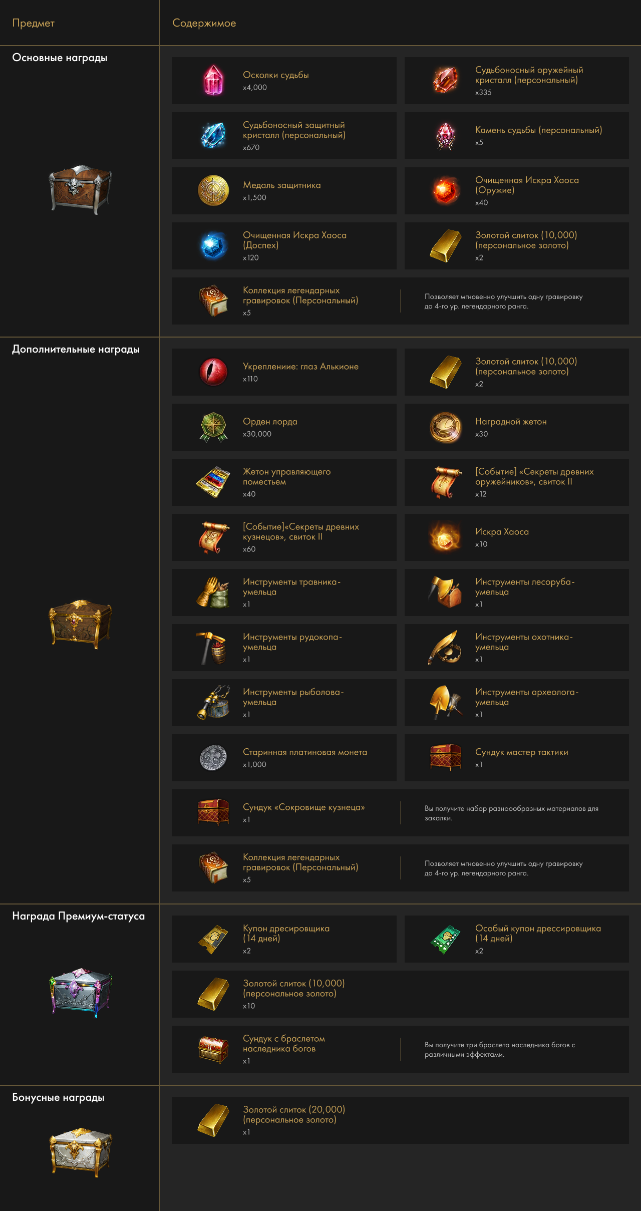 - На каждом уровне испытания есть бонусная награда, которой можно лишиться, если не соблюсти условия по рейтингу снаряжения. Бонусная награда в каждом испытании формируется из персонального золота. Например, если у испытания необходимый уровень 1650, то бонусную награду за него смогут получить только персонажи с рейтингом снаряжения 1649–1650 на момент испытания.