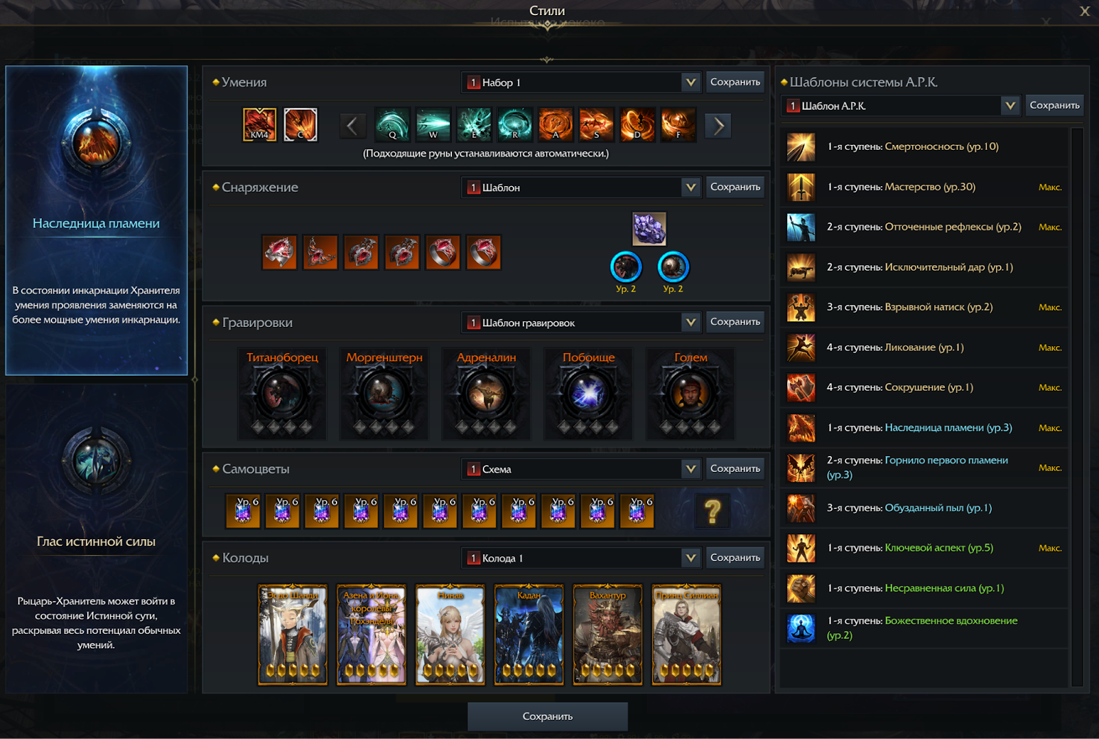 Воспользуйтесь функционалом «Настройка стиля боя» для персонажей-участников в «Испытаниях мококо». Он позволяет выбрать одну из двух классовых гравировок и получить для нее автоматическую настройку умений и всего снаряжения: аксессуаров, фетранита, самоцветов, гравировок, эффект комплекта.