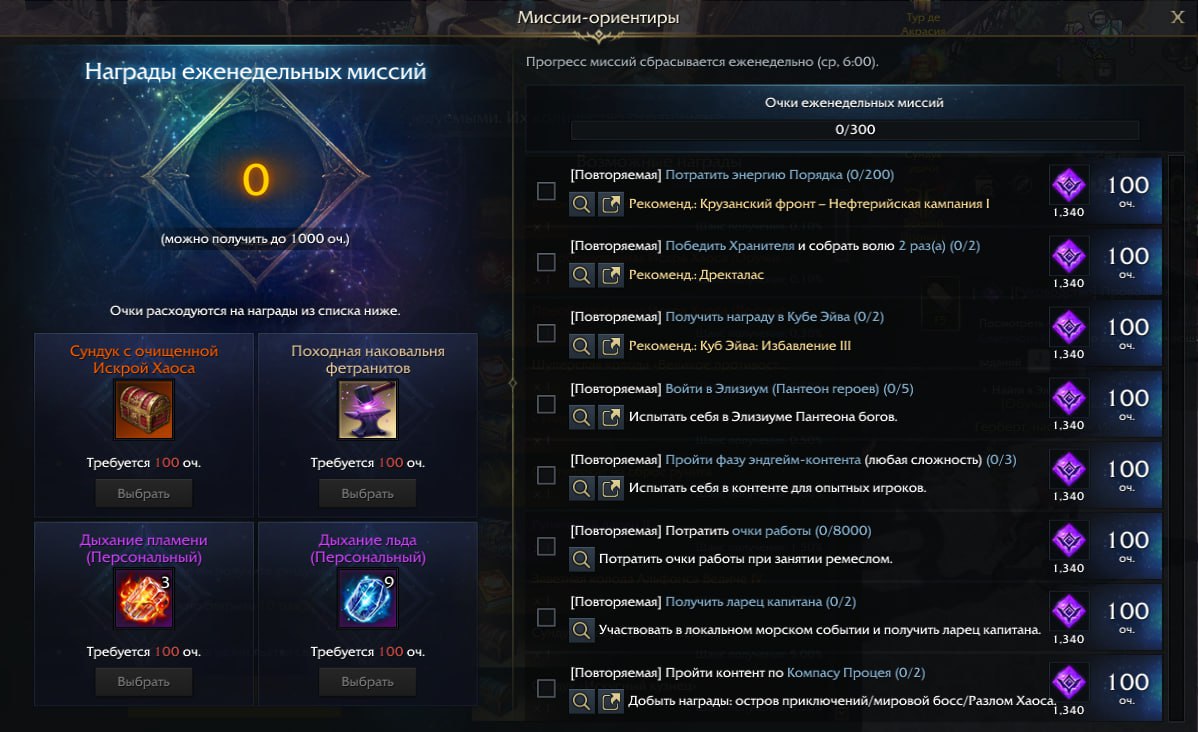 Еженедельные миссии — это задания на выполнение различных внутриигровых активностей. За их выполнение персонаж будет получать очки. В течение одной недели можно заработать не более 300 очков, при этом их лимит на персонаже ограничен 1000 единицами. При достижении этого значения персонаж перестанет получать новые очки. Накопленные очки можно будет обменивать на различные предметы прямо в интерфейсе Еженедельных миссий.