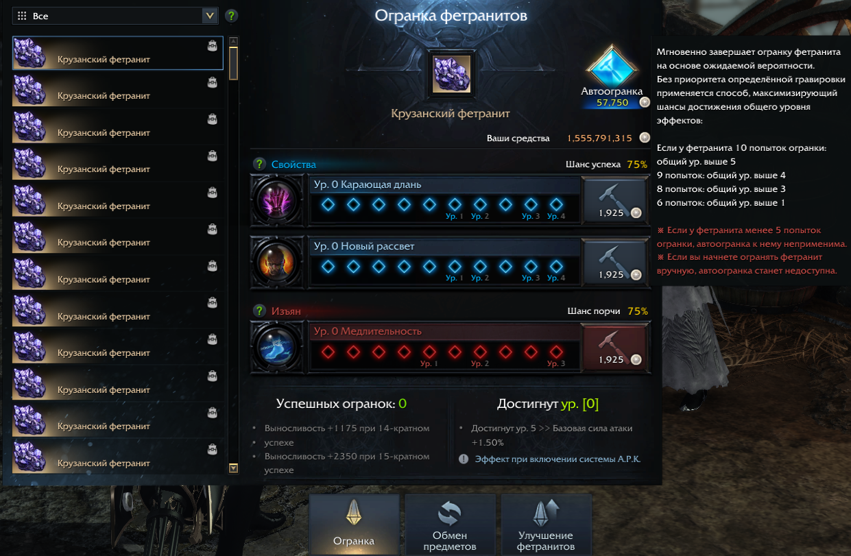 Для удобства игроков будет добавлен ряд функций ускорения и автоматизации. Появятся функции массовой закалки снаряжения (10 раз за одно нажатие), повышения его качества и кармы, а также автоматической огранки фетранитов.При достижении следующего уровня улучшения процесс будет останавливаться автоматически. При улучшении качества и кармы сначала будут тратиться очищенные искры. Также добавится функция автоматического распыления фетранитов, если их суммарный уровень окажется ниже указанного игроком порога.