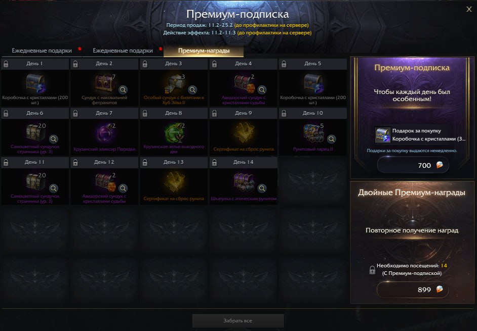 После 14-го входа в игру с активной подпиской все награды календаря (кроме коробочки с кристаллами (300 шт.) за первую активацию) можно получить повторно за 899