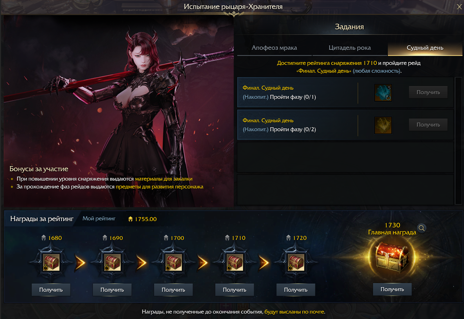 Воспользуйтесь бонусом за участие: при повышении уровня снаряжения выдаются материалы для закалки, а за прохождение фаз рейдов — дополнительные предметы для развития персонажа.
