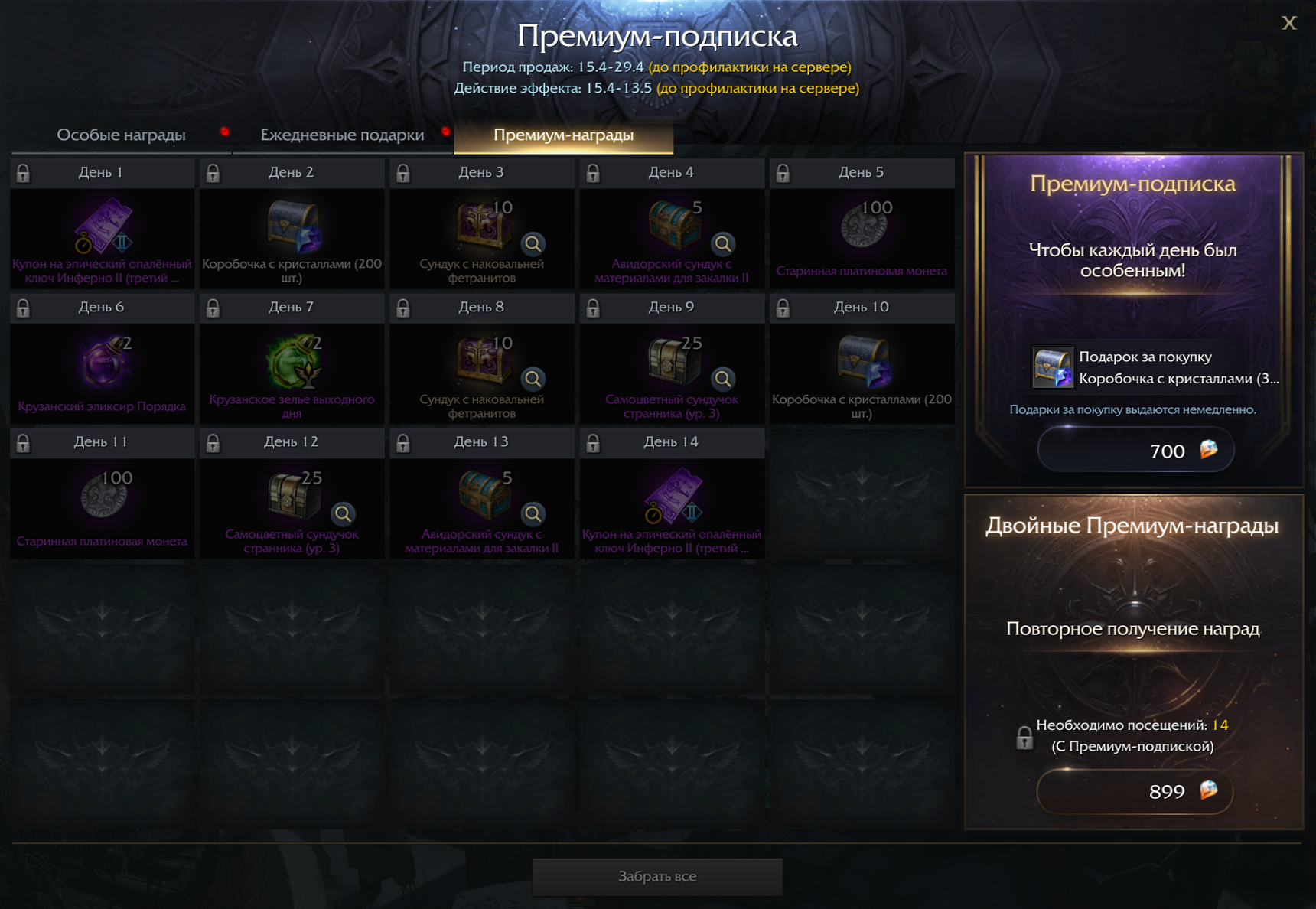 - После 14-го входа в игру с активной подпиской все награды календаря можно получить повторно за 899