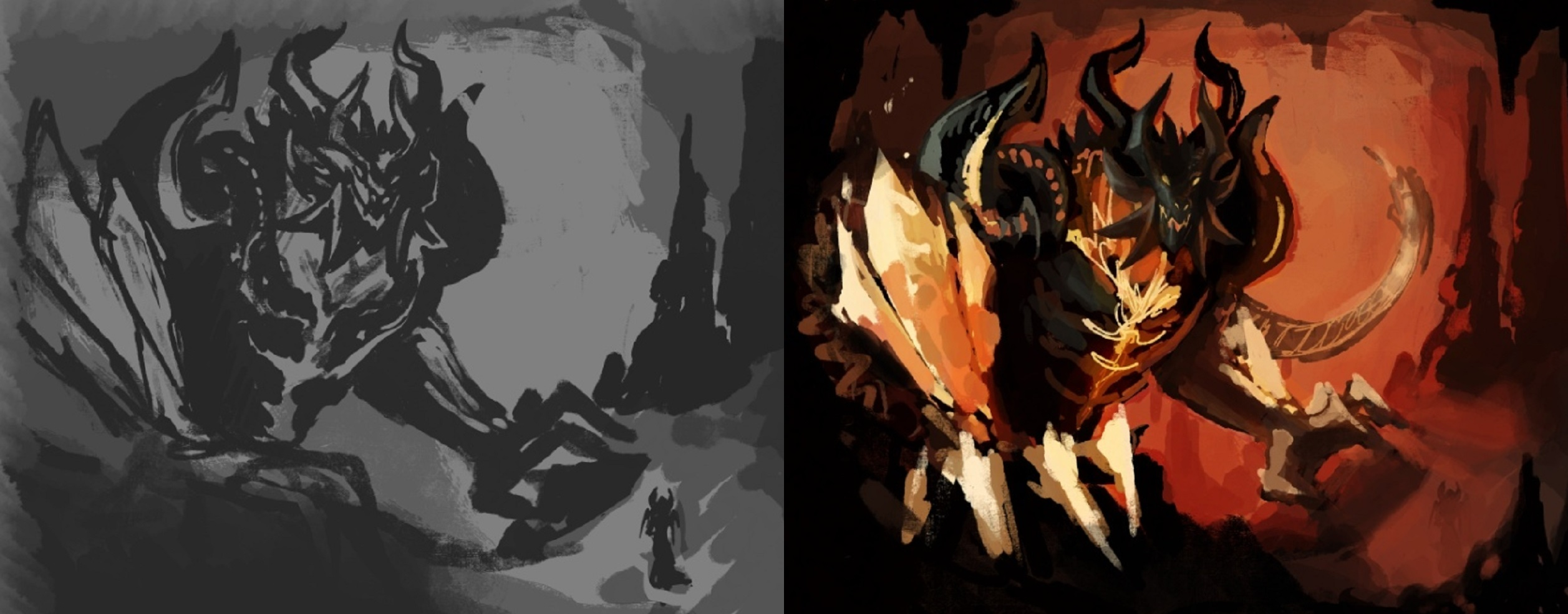 Обычно я делаю несколько черно-белых набросков, выбираю лучший и работаю с ним. Потом начинаю добавлять цвет, создавая «подмалевок», как в работе маслом (привычка с художки). В конце прорисовываю персонажа, окружение, добавляю детали.