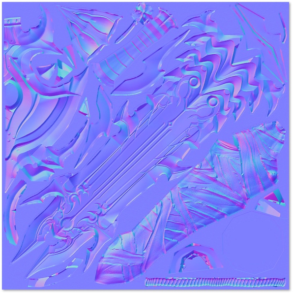 - Это карта «нормалей». Нормали — это выпуклости, но не объемные. Они всего лишь показывают, где на модели вмятины или наоборот выступы. Отчасти именно эта текстура отвечает за объем модели.