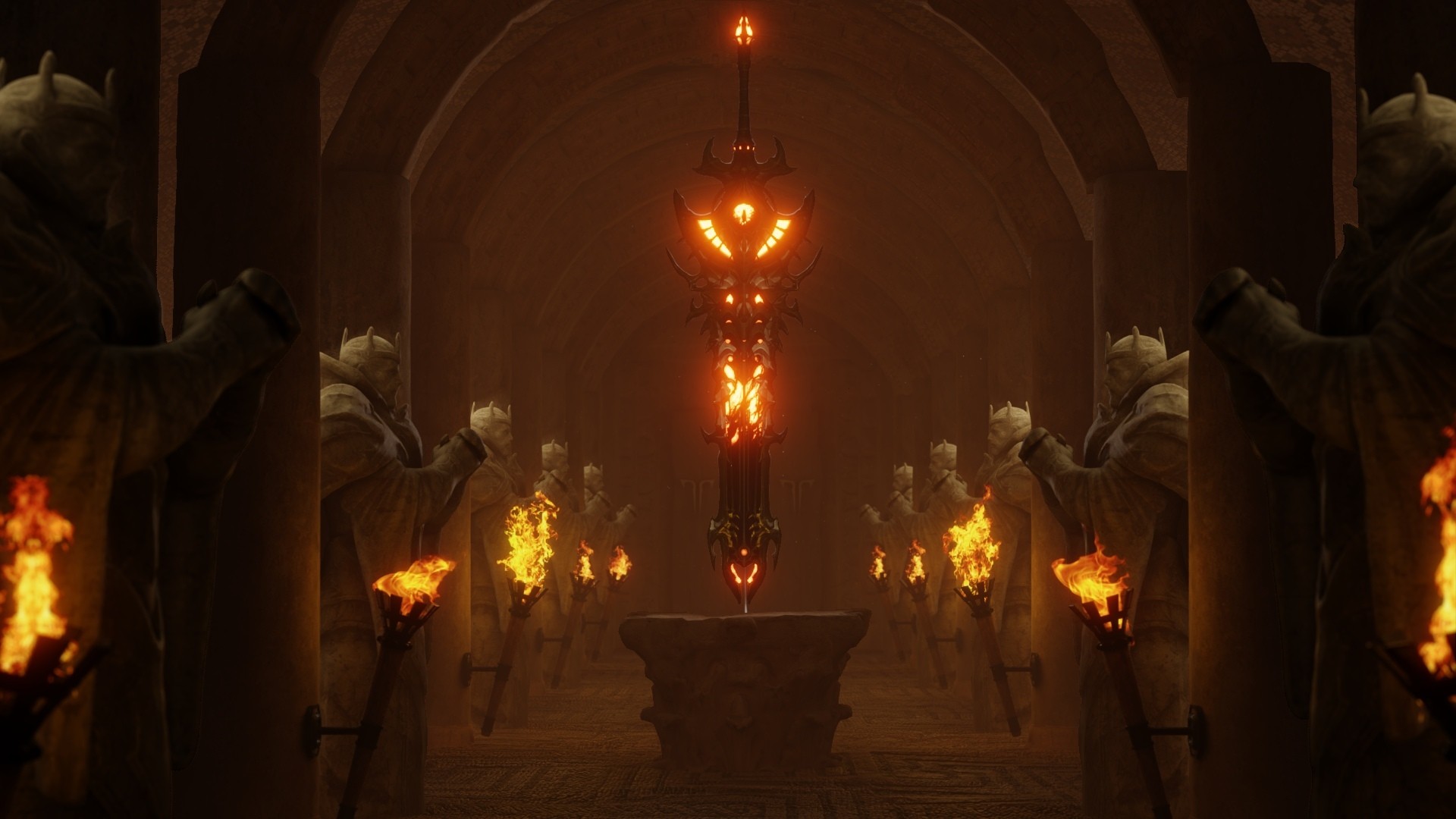 Тут мне не понравилось освещение на статуях и свет в конце тоннеля. А также огромное количество статуй и факелов. Все это “нагружало” сцену. И сама яркость меч терялось на фоне света в конце тоннеля. Поэтому, принято решение «застроить» выход, оставив маленькую щелочку внутри и сделать логотипы LOST ARK на этих дверях.