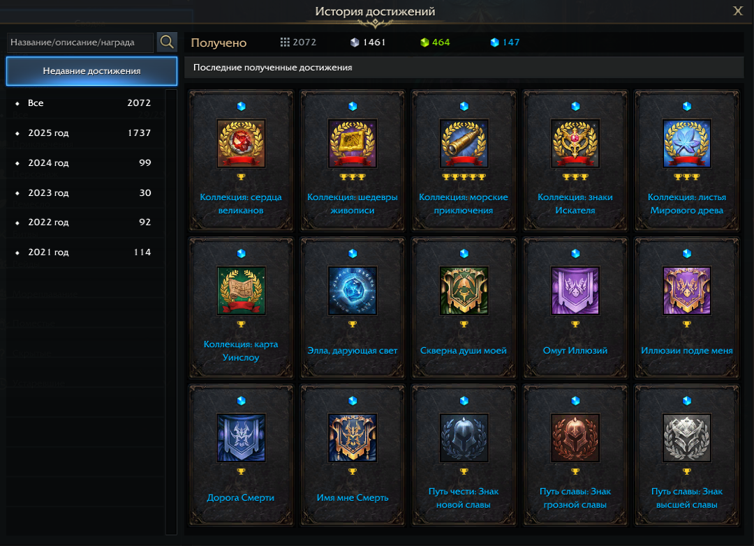 В окне сводки можно найти информацию об истории достижений разделенную по годам.