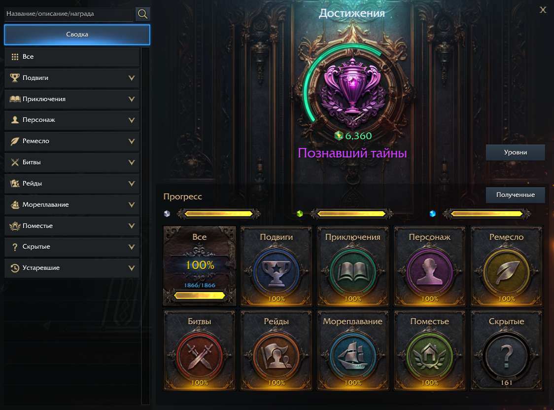 Каждое достижение разделено по категориям и рангу. Количество выполненных достижений в соответствии с рангом и категориям можно увидеть в Сводке.