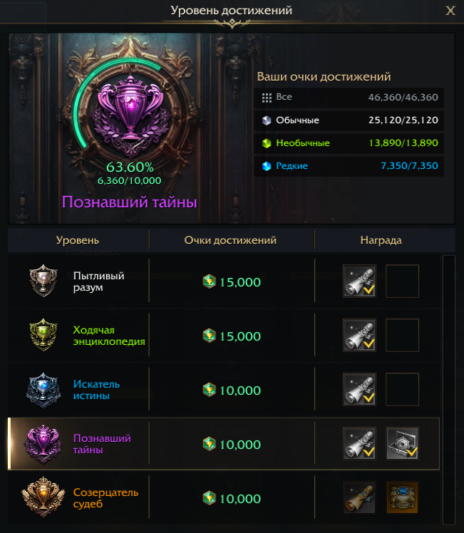 По умолчанию для перехода к интерфейсу «Достижения» используется сочетание клавиш Alt+O, также можно выбрать одноимённый пункт в главном меню Esc или на нижней панели навигации в разделе «Достижения». В правом верхнем углу окна можно настроить удобный фильтр: отобразить все, полученные или не выполненные достижения, а также достижения с наградами.