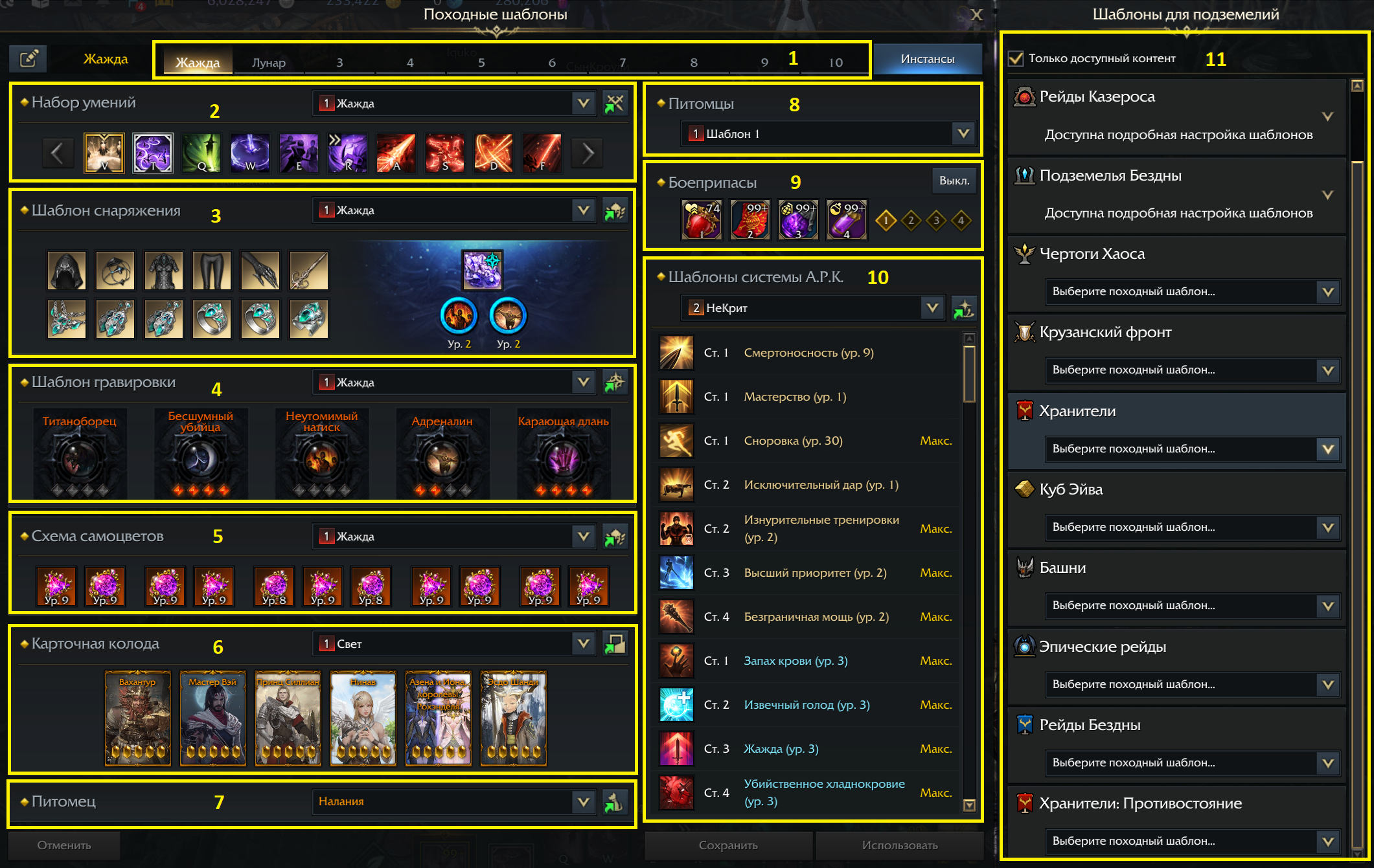 Многие из упомянутых вкладок требуют предварительной настройки. Например, для гравировок можно иметь вплоть до 10 пресетов, настраиваемых в окне Alt + I или в окне персонажа. Обратите внимание - слоты пресетов во вкладке походных шаблонов бесплатны и доступны по умолчанию, а некоторые из вкладок имеют ограниченное число доступных сразу слотов, количество которых можно увеличить с помощью кристаллов.
